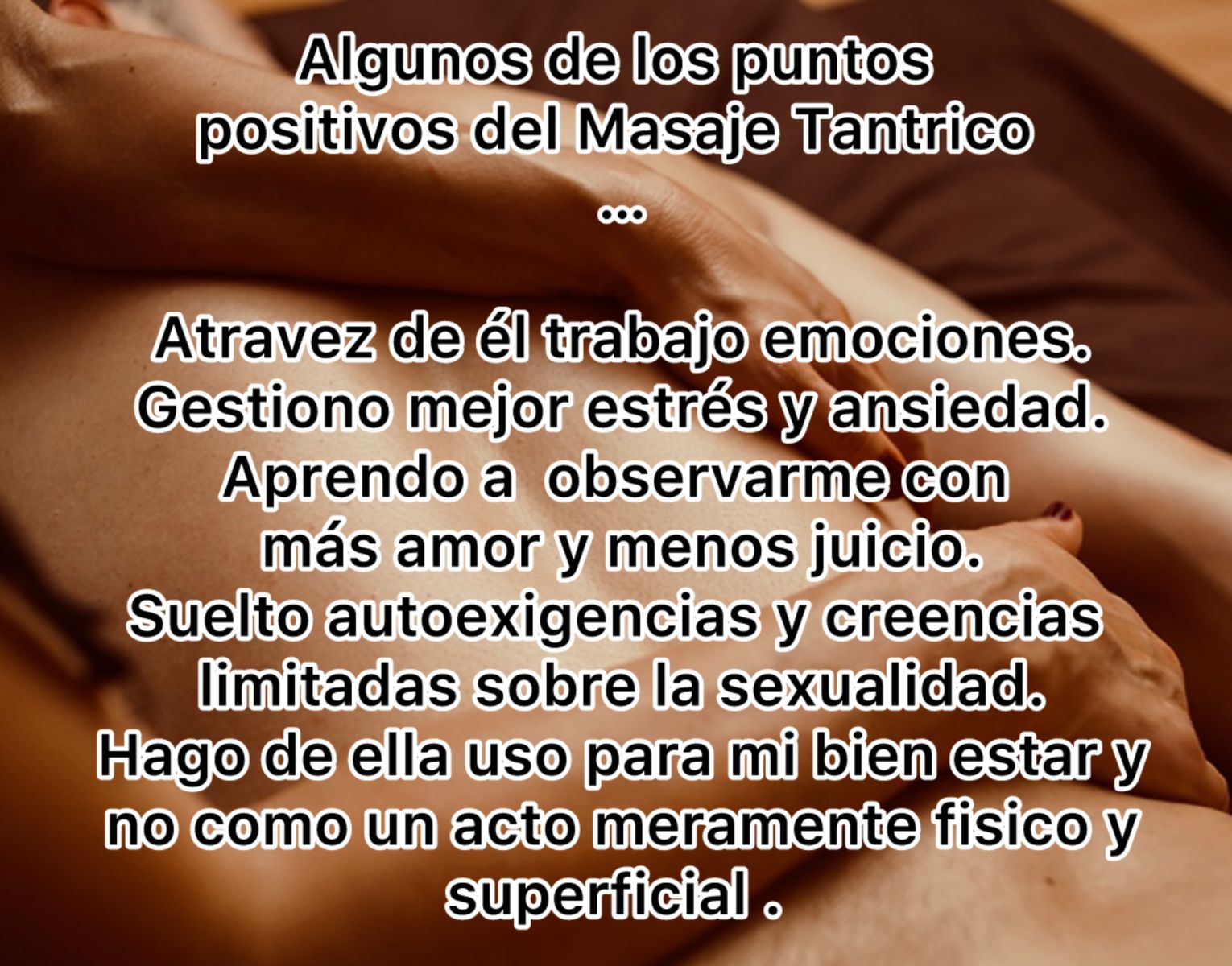 Este mismo tiene una filosofía y práctica con un foco distinto al masaje erótico . Unos de los principales puntos es el bien estar psicológico y emocional y la relación sana ,consciente y respetuosa con quien compartimos e intercambiamos un momento de intimidad y con nosotros mismos sin vanalizarla. Brindando una sesión que cubre muchos más aspectos que el masaje erótico ( enfocado principalmente en genitales y placer atravez de ellos sin cubrir otros aspectos) .